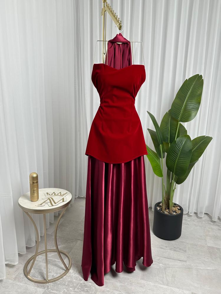 الفستان يظهر بتصميم أنيق وفخم، ويتميز بالتفاصيل التالية: