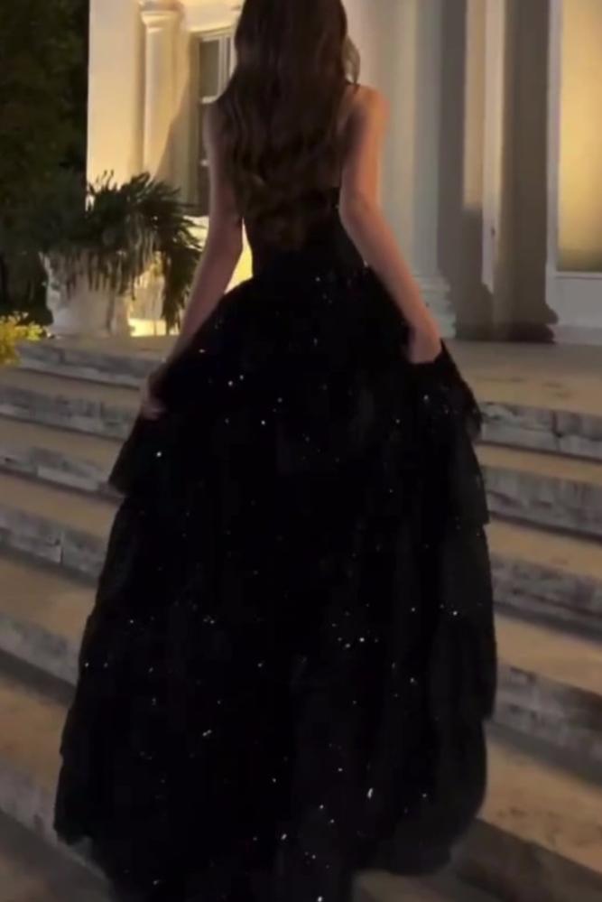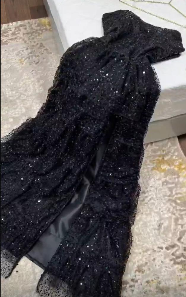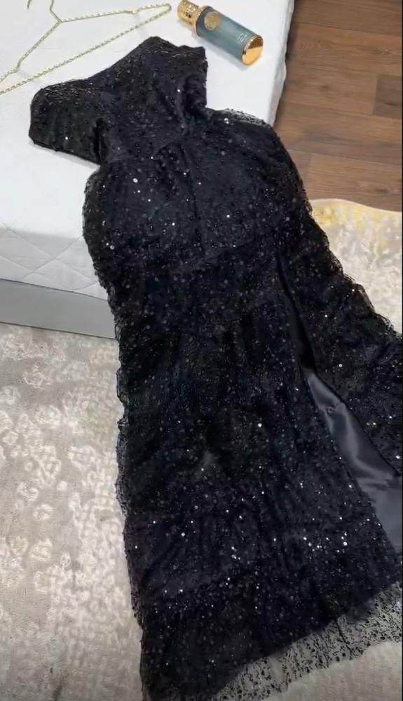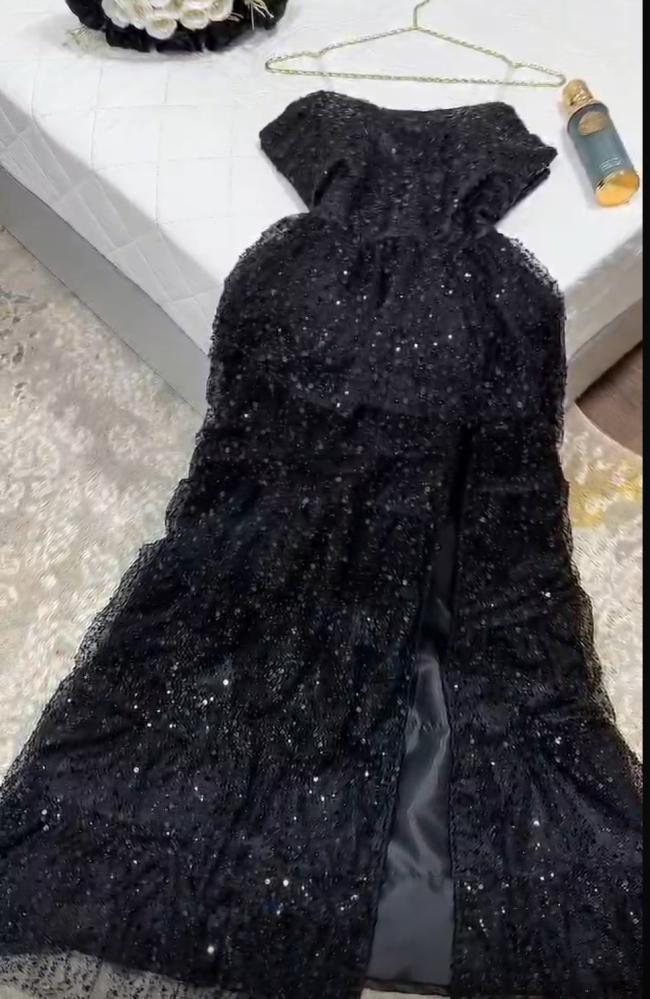 فستان أسود بفتحه ساق طويل ومزين بالترتر